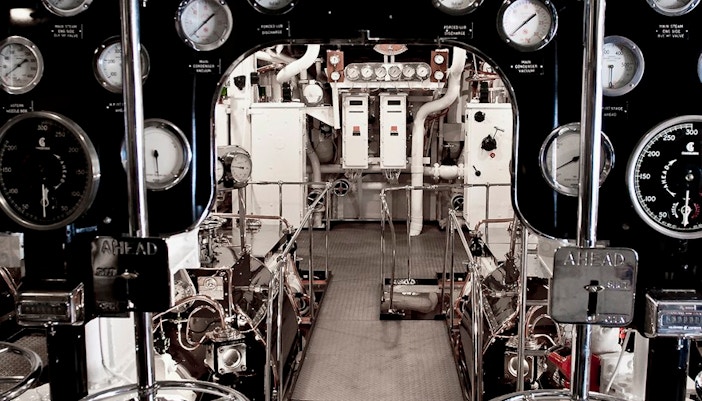 Stand among polished brass pipes, control panels, and heavy machinery that powered the yacht across global voyages, with every surface maintained to reflect the precision and reliability required during active service.