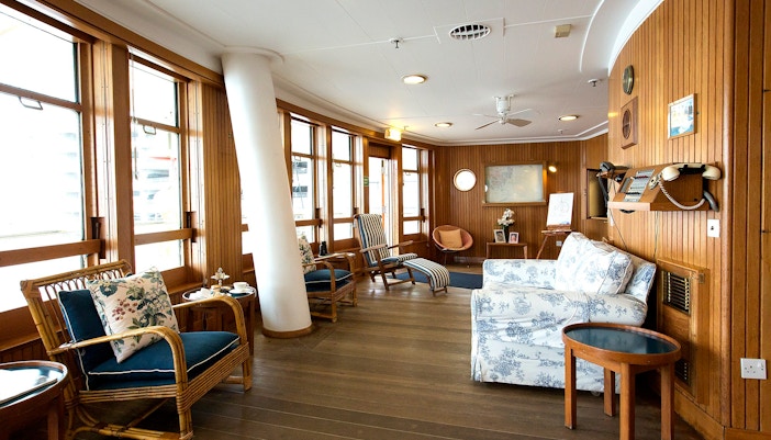 Wander the State Apartments, including the Sun Lounge and Dining Room, where furniture, table settings, and personal items reflect how the Royal Family hosted guests at sea.