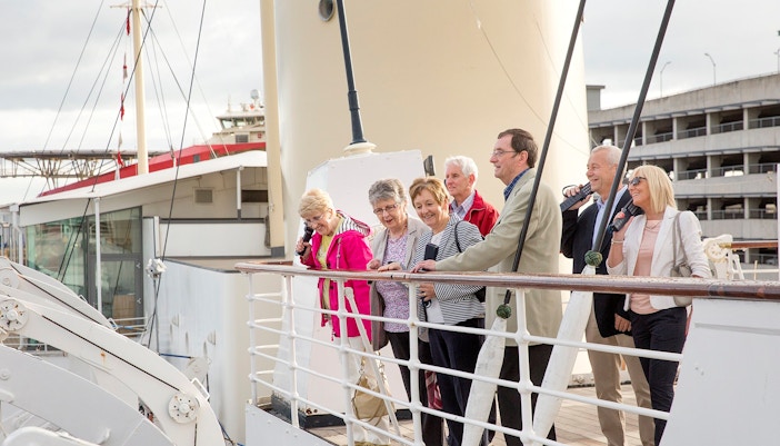 Walk along wide outdoor decks with uninterrupted views of the harbour, where open air, sea breeze, and clear sightlines help you understand the yacht’s scale and how movement shaped life onboard.